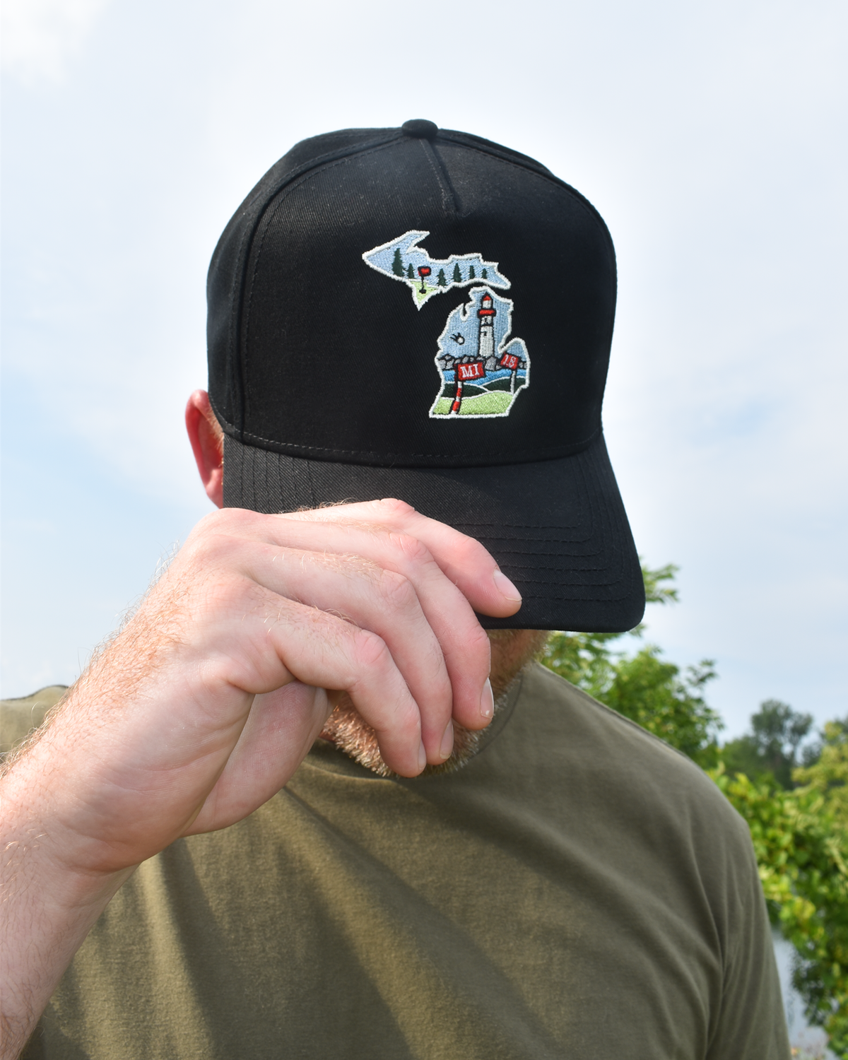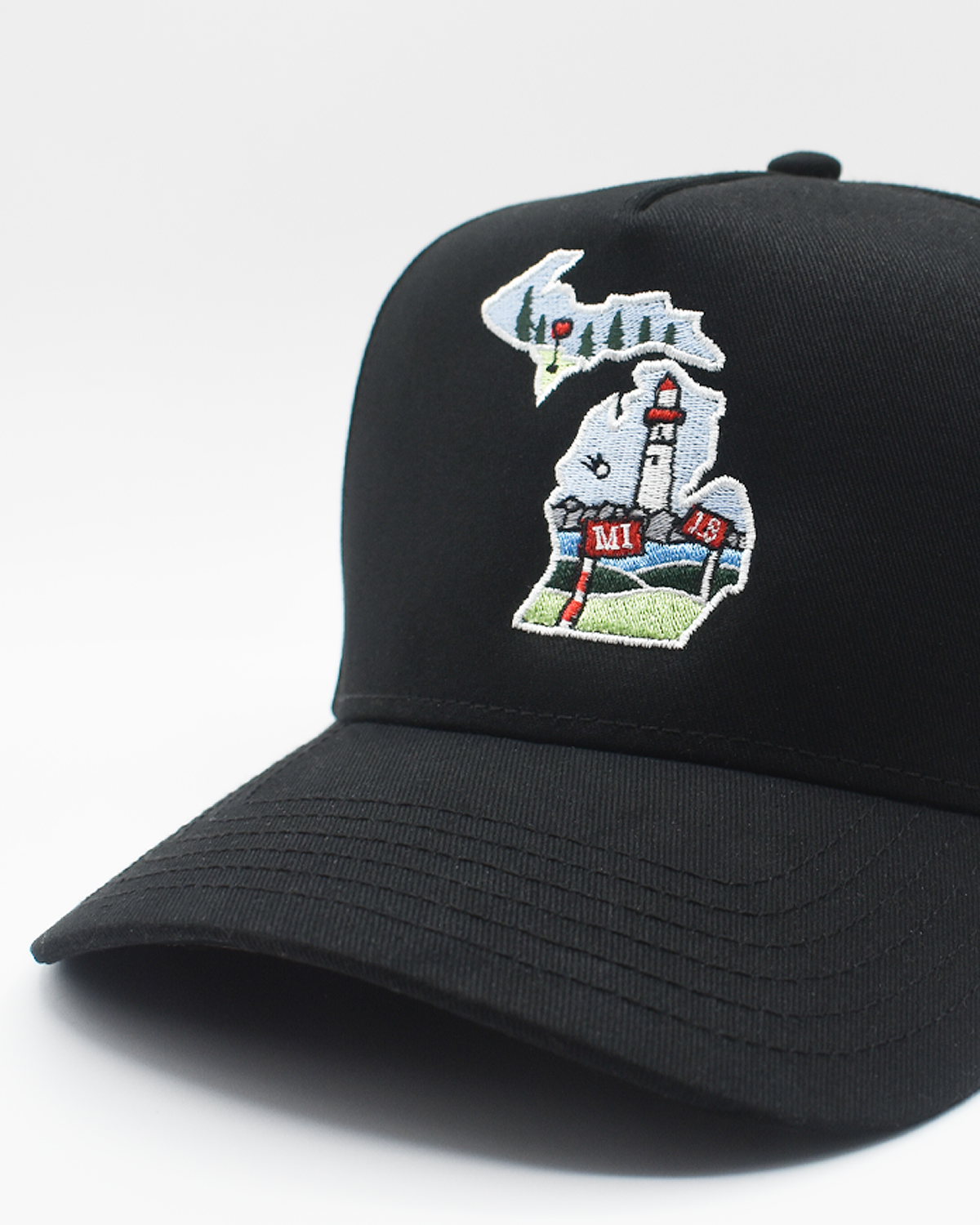 Embroidered dead center is Michigan’s iconic shape, featuring subtle golf details woven into the landscape — flagstick, lighthouse, greens — nodding to the game we love and the place that raised us.
