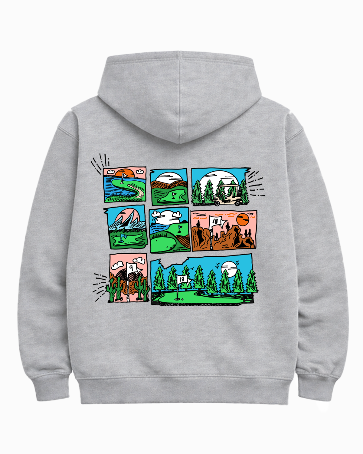This design is basically a whole round of golf packed onto the back of a hoodie. Each panel is a different scene, different states, different landscapes, different moments you only get from being out on the course. Mountains, desert, coastlines, tree-lined fairways, all the places the game can take you.