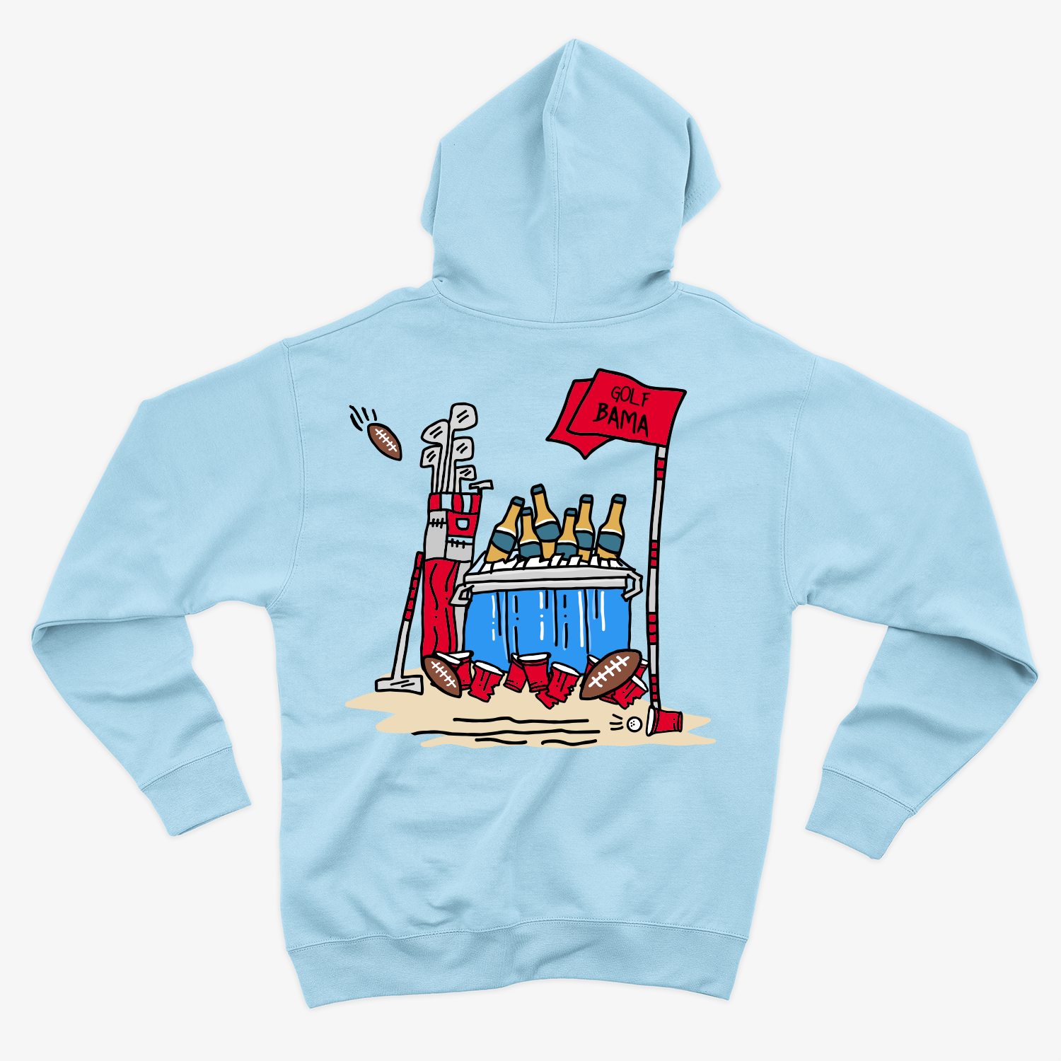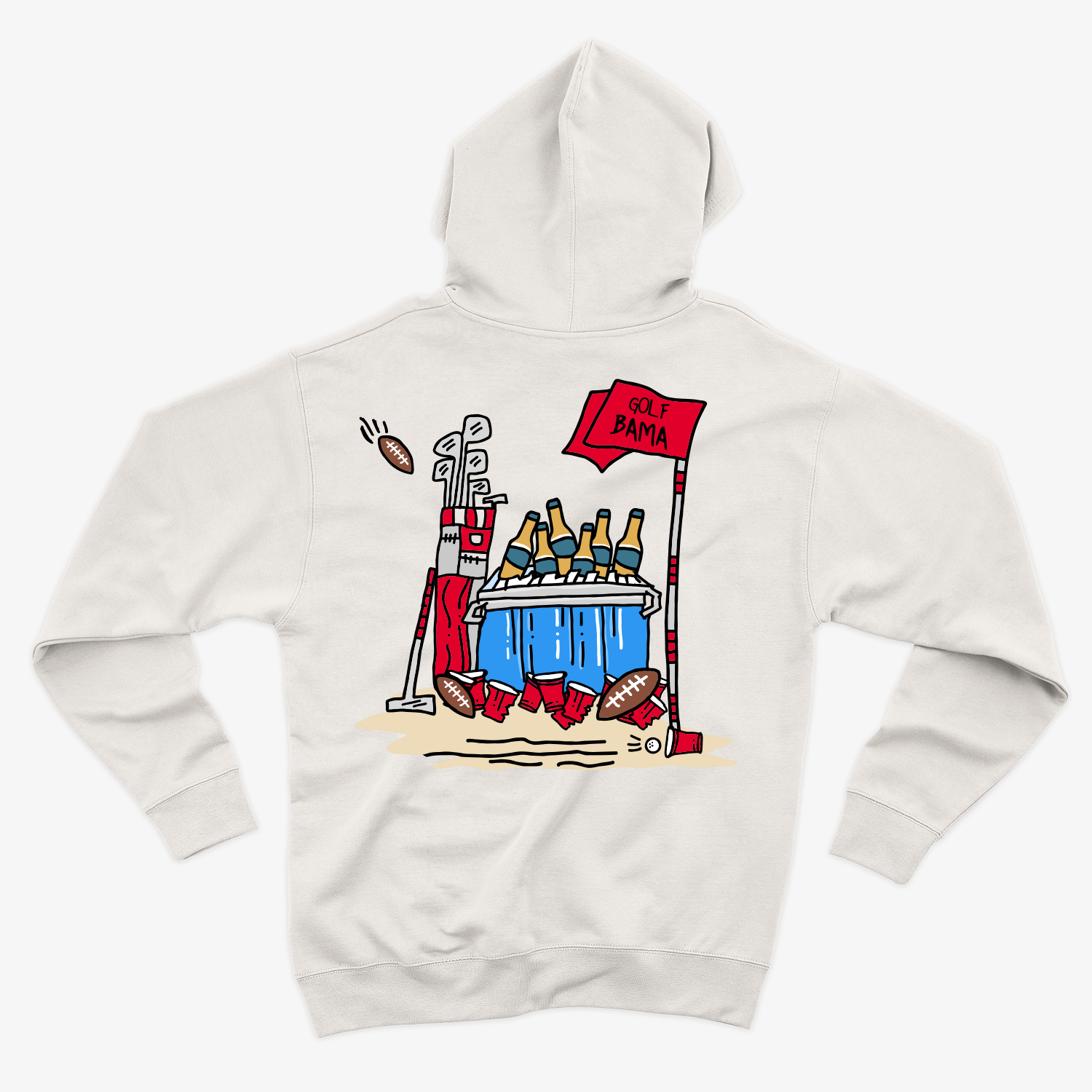 Inspired by Alabama’s legendary tailgate culture, the design features a beer-filled cooler, flying footballs, and red solo cups scattered across the sand — with one of them acting as a golf hole, all flying under a bold "Golf Bama" flag.