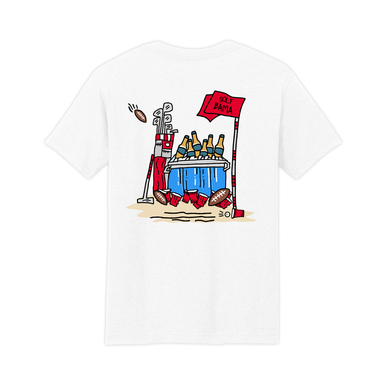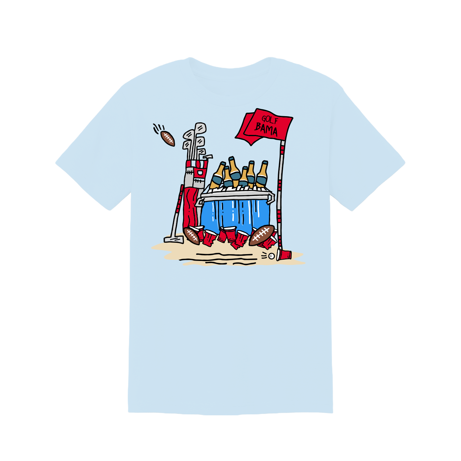 Inspired by Alabama’s legendary tailgate culture, the design features a beer-filled cooler, flying footballs, and red solo cups scattered across the sand — with one of them acting as a golf hole, all flying under a bold "Golf Bama" flag.