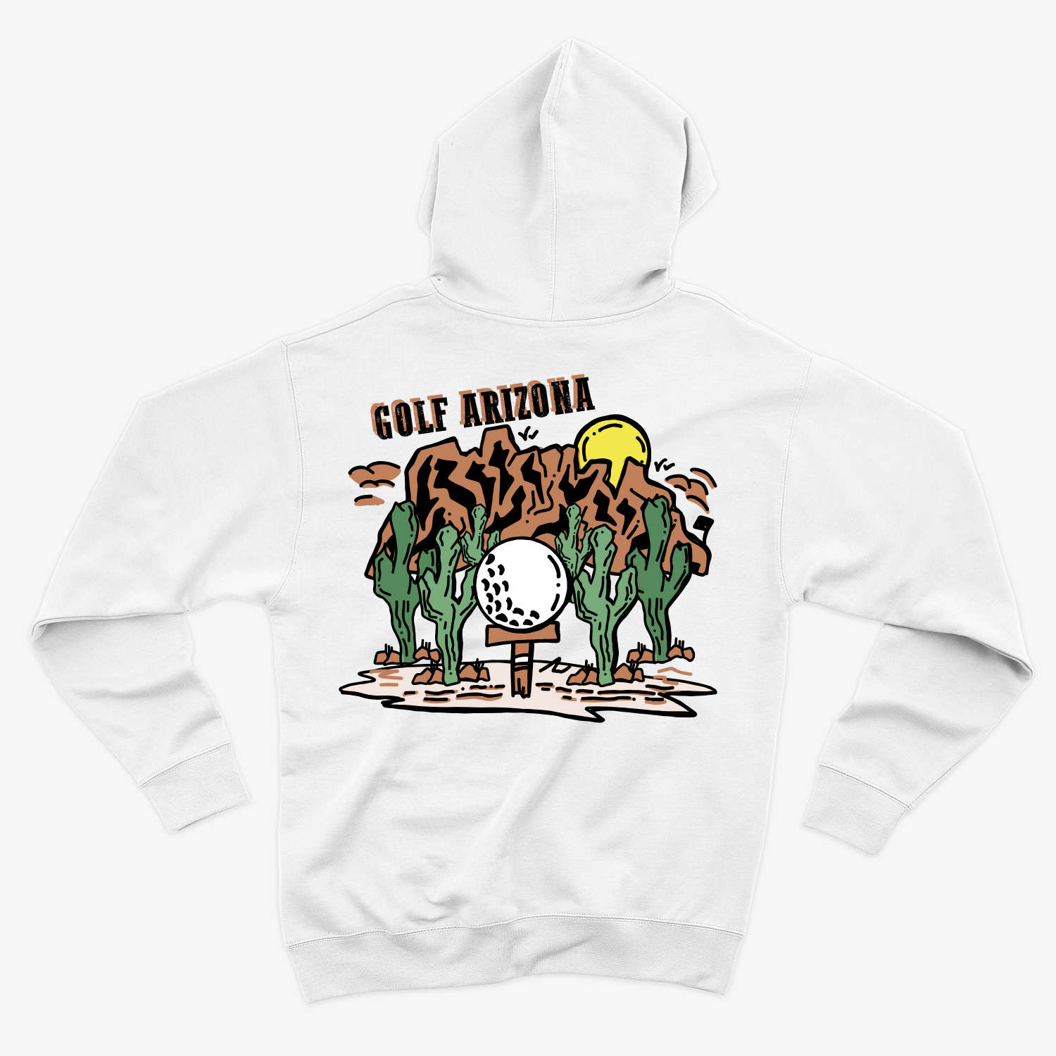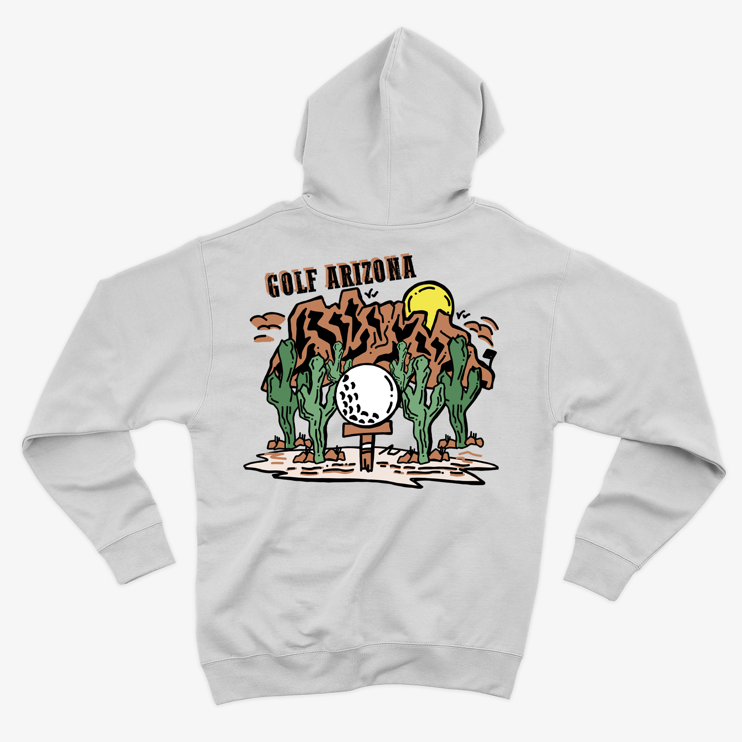 Featuring a minimalist design of towering cacti and rugged Arizona mountains, this hoodie blends natural beauty with golf culture.