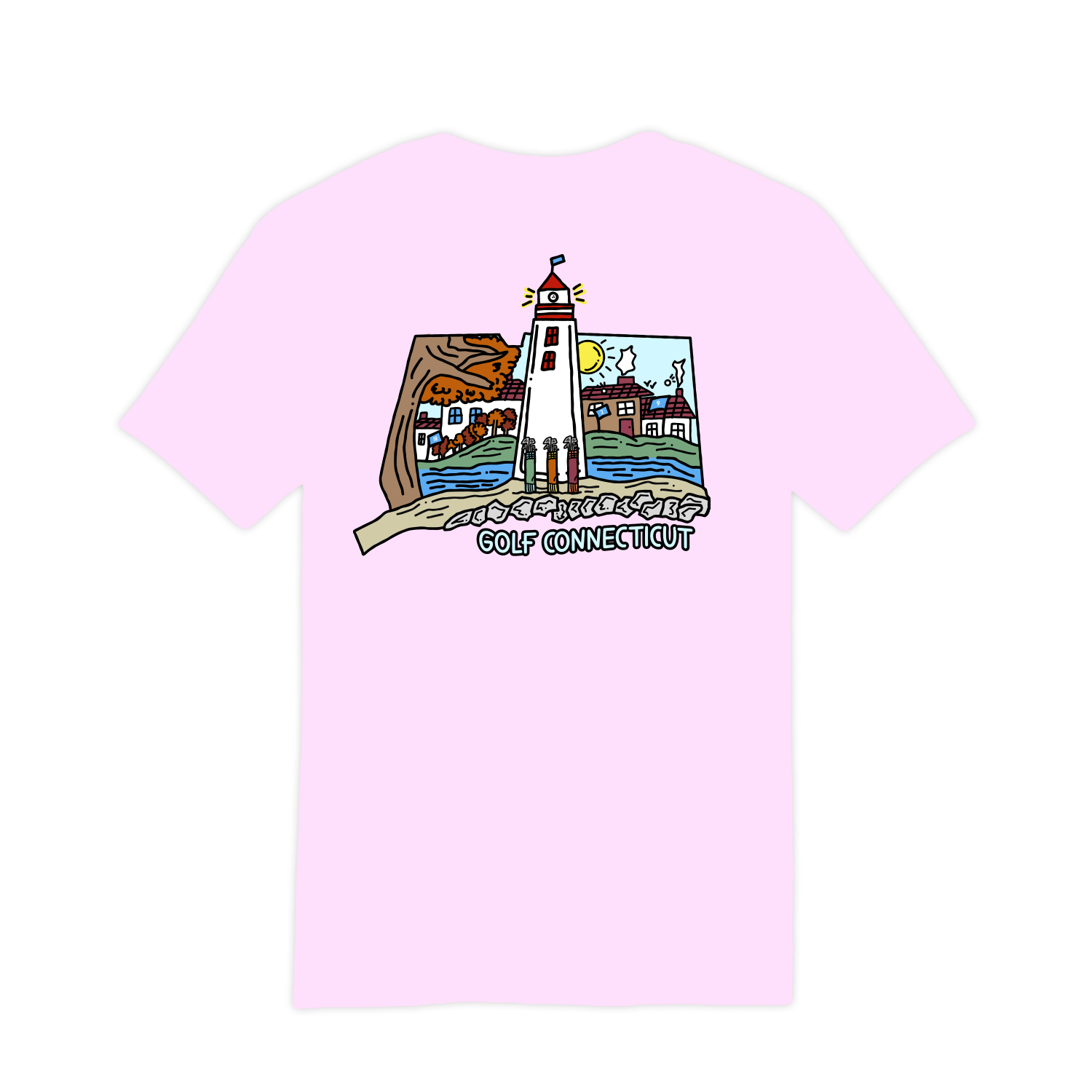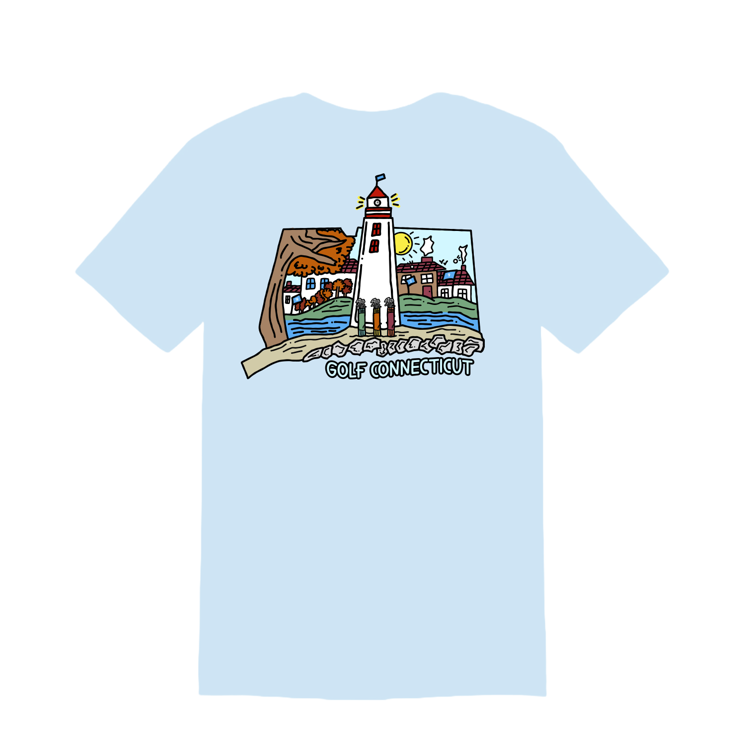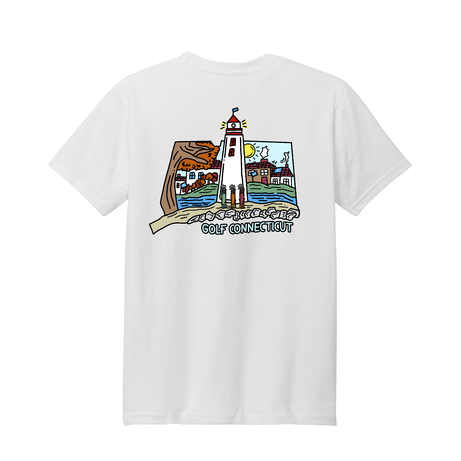 This Golf Connecticut tee blends the crisp spirit of fall with the timeless charm of the Connecticut coast. Featuring a silhouette of the state, iconic lighthouses, and autumn tones, it’s a nod to golden leaves, salty air, and a smooth swing. A tribute to small towns, seaside greens, and fall golf at its finest.