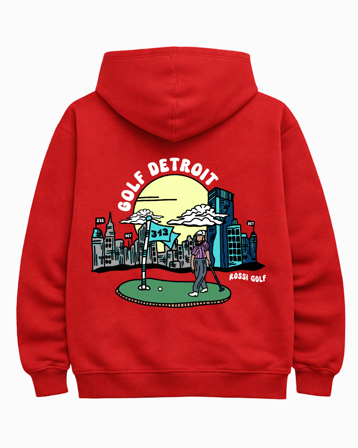 This hand-drawn design captures a surreal blend of downtown Detroit and the game of golf — a golfer stands on the green, framed by the city skyline, iconic buildings, and a 313 flag waving under a golden sun.