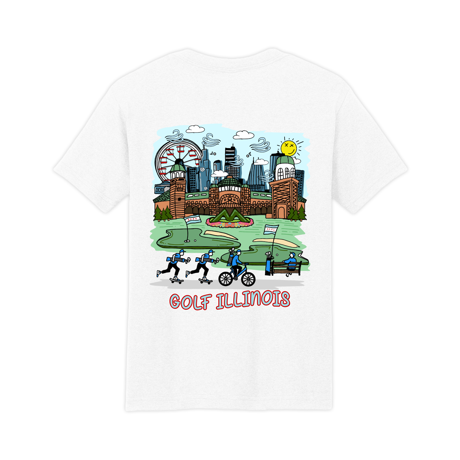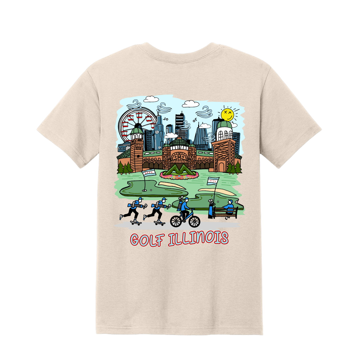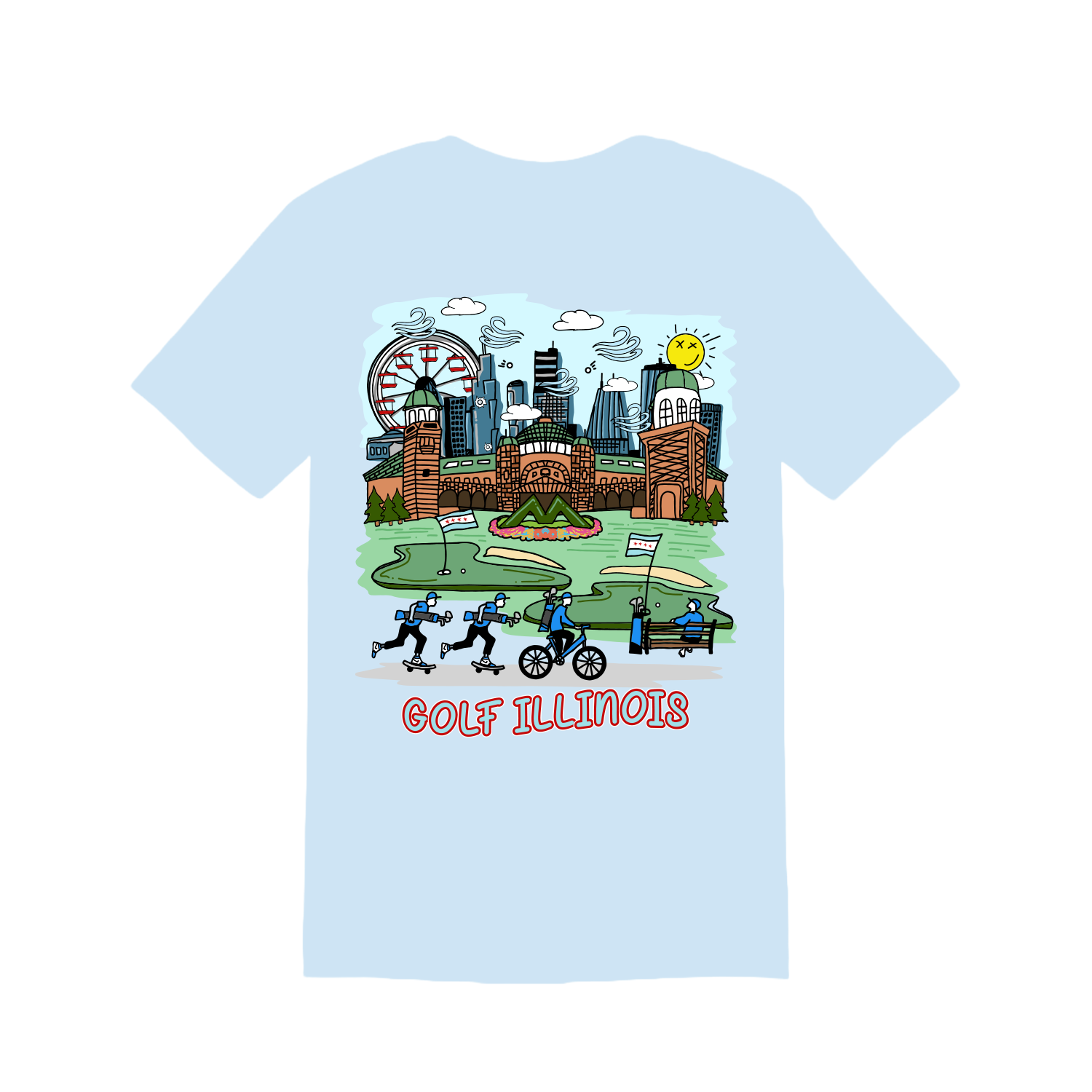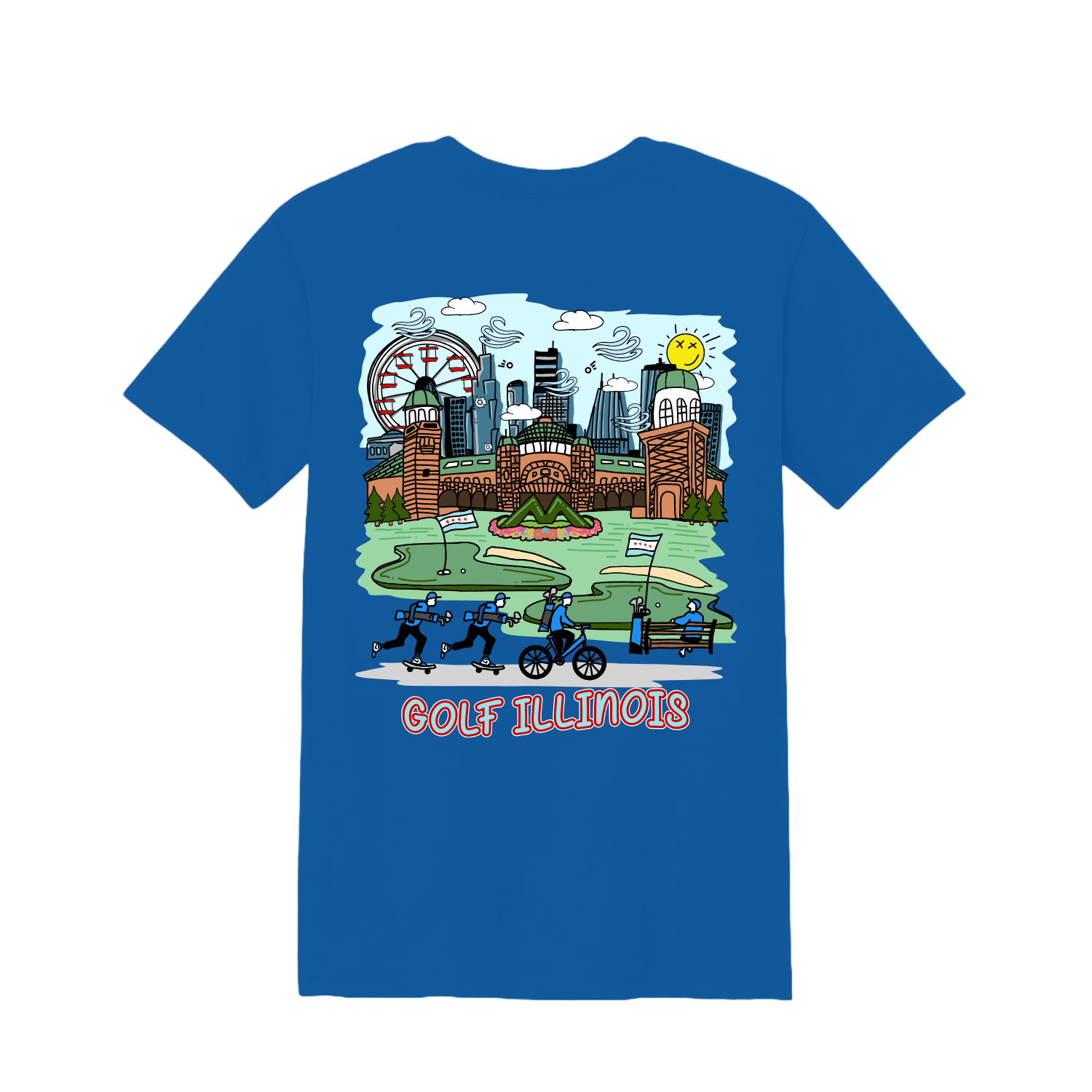 This hoodie pays tribute to Illinois golf with inspiration from Medinah Country Club, one of the state’s most iconic courses. The design blends the elegance of Medinah with the energy of the Chicago skyline, framed by elements of the Chicago flag for a bold local touch.