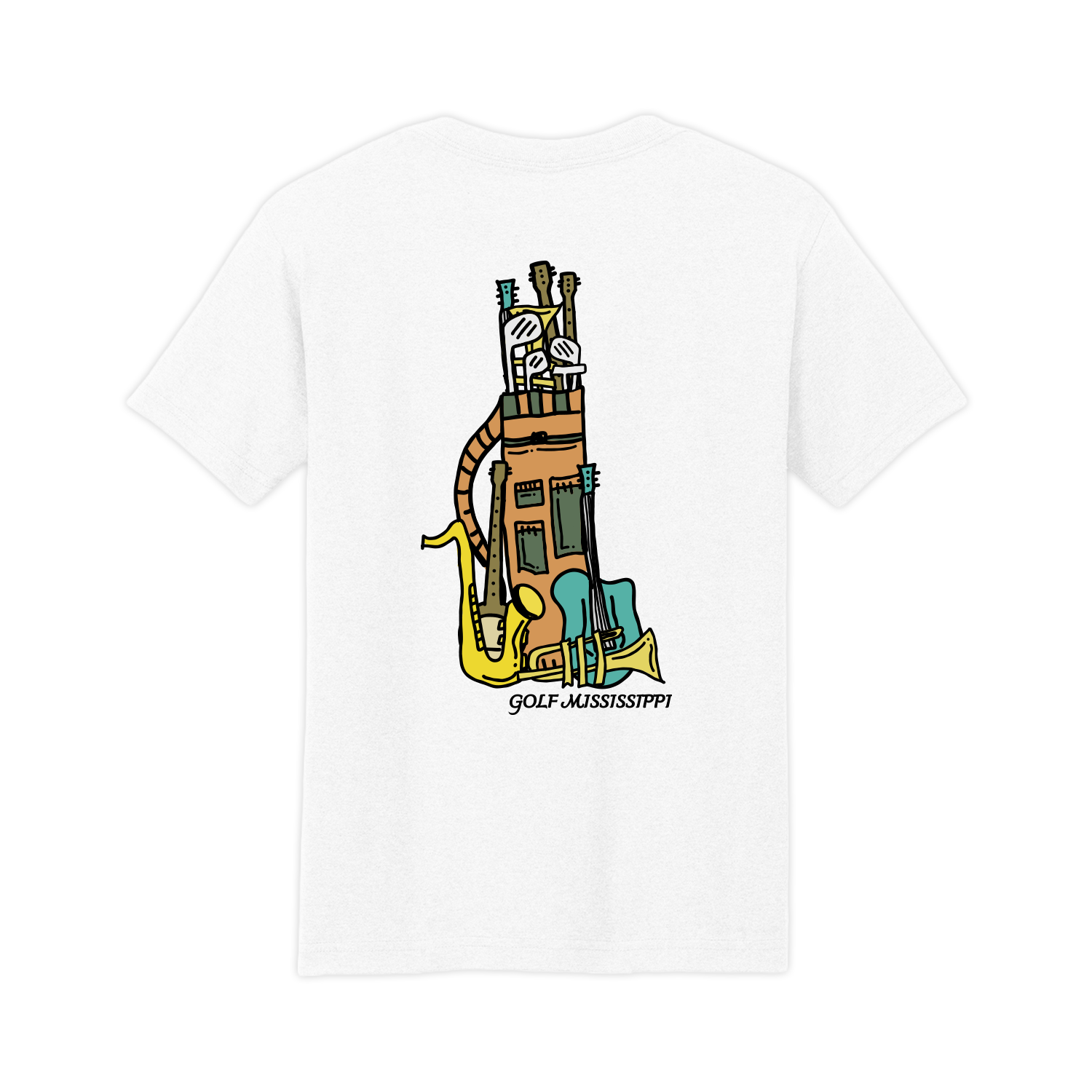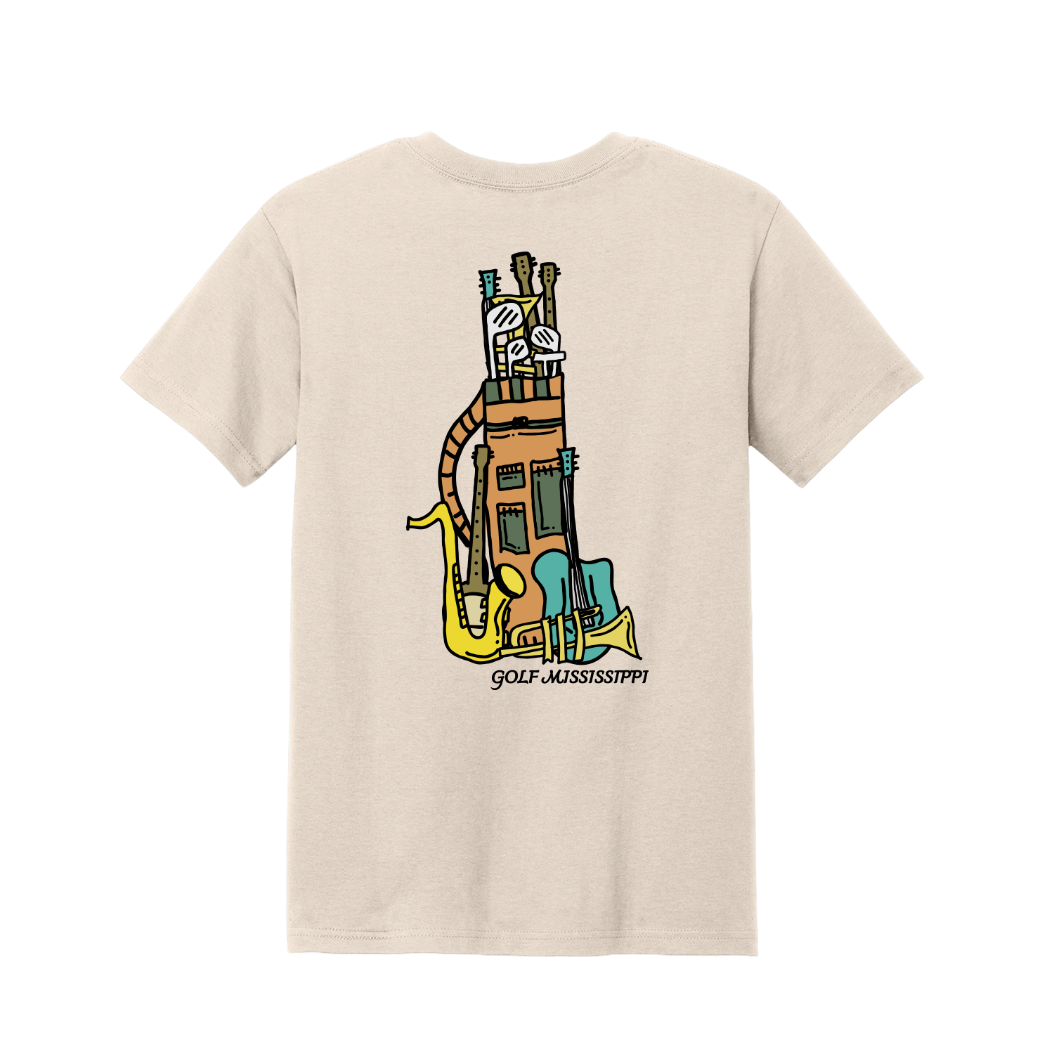 This tee fuses Mississippi’s rich musical soul with the game of golf, featuring a one-of-a-kind graphic: a vintage golf bag filled not with just irons, but with classic blues instruments.