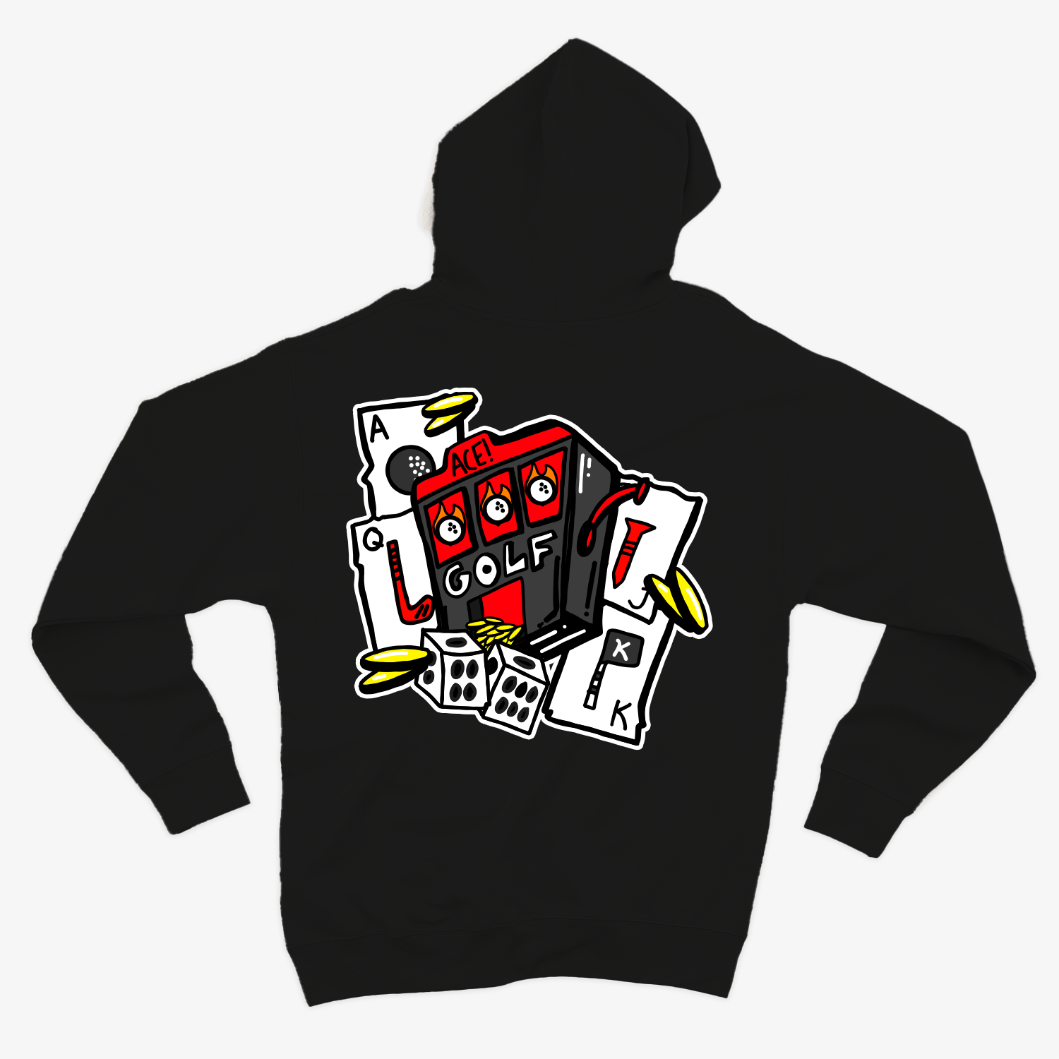 This hoodie is a wild card in the collection — a Vegas-inspired mashup of golf and classic casino chaos. At the center, a bold red slot machine spells out “GOLF” with a jackpot of aces, surrounded by flying poker chips, playing cards and dice.