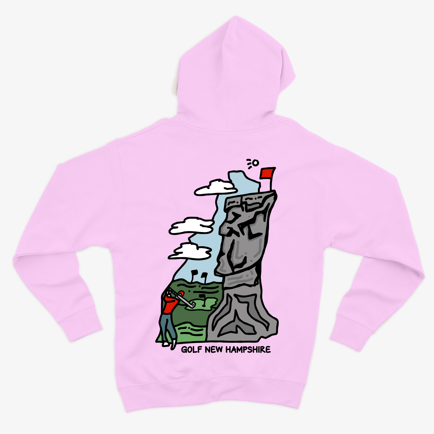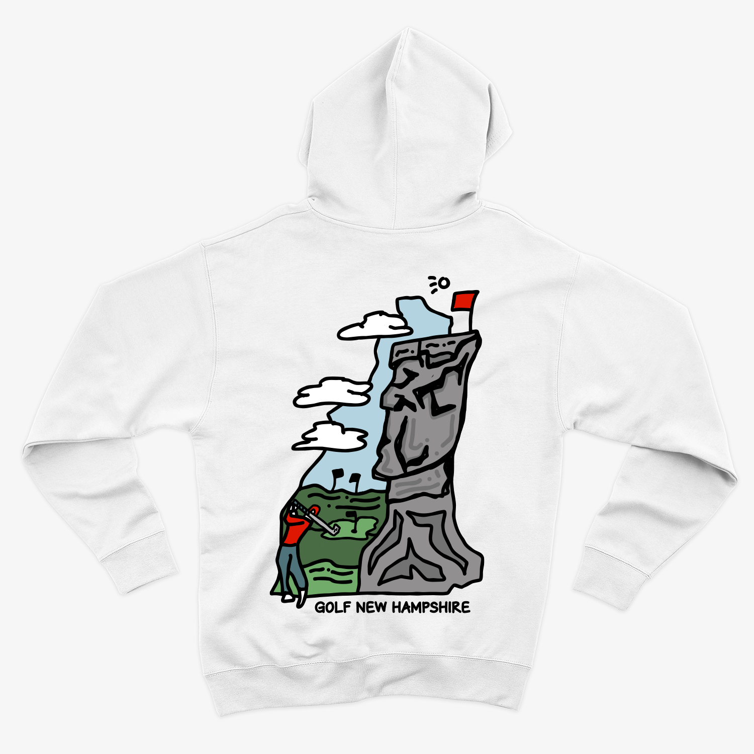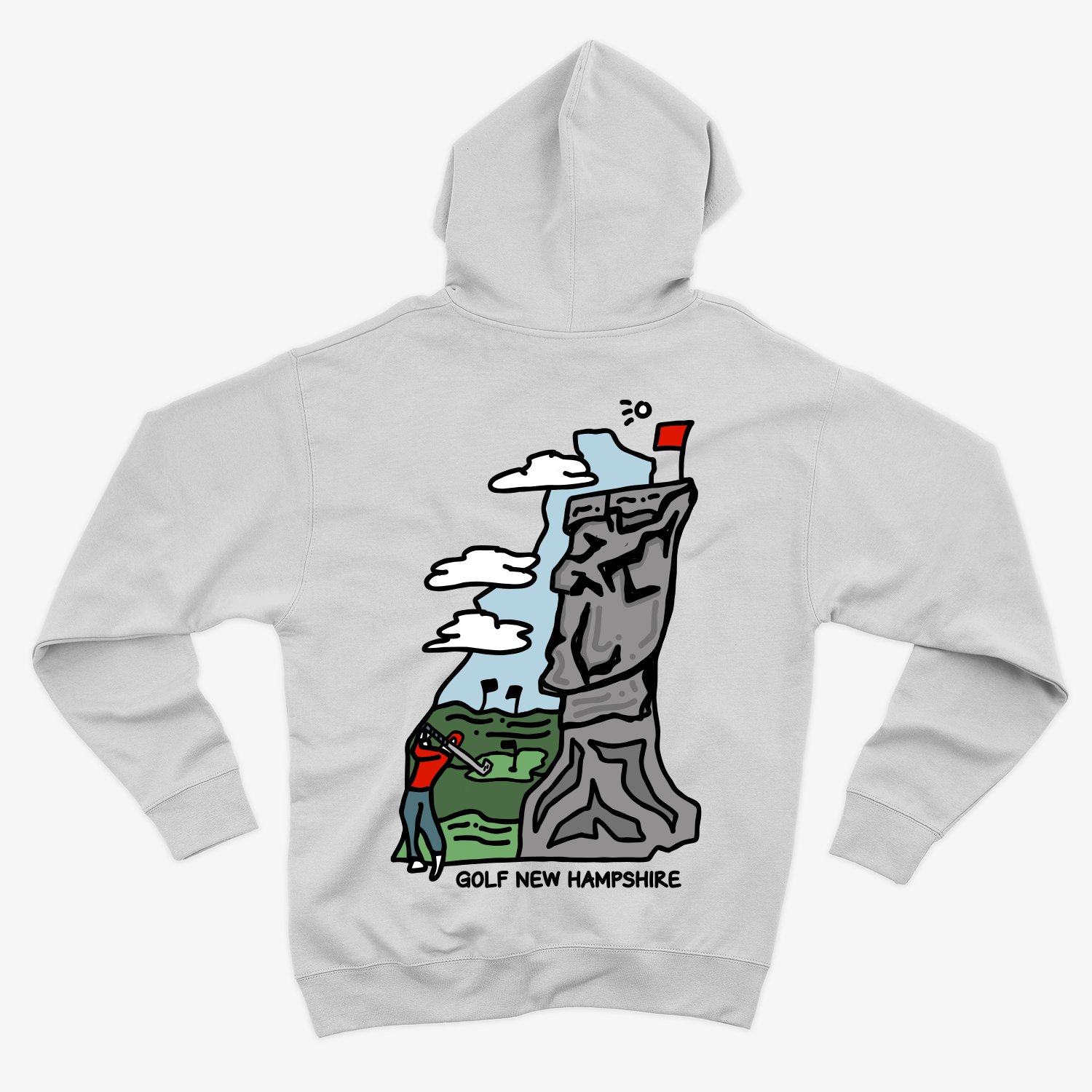 This Golf New Hampshire tee draws inspiration from the legendary Old Man of the Mountain—New Hampshire’s most iconic natural profile. The silhouette of the broken granite face is subtly woven into the design alongside a Rhode Island state outline, symbolizing a blend of Northeast golf pride.