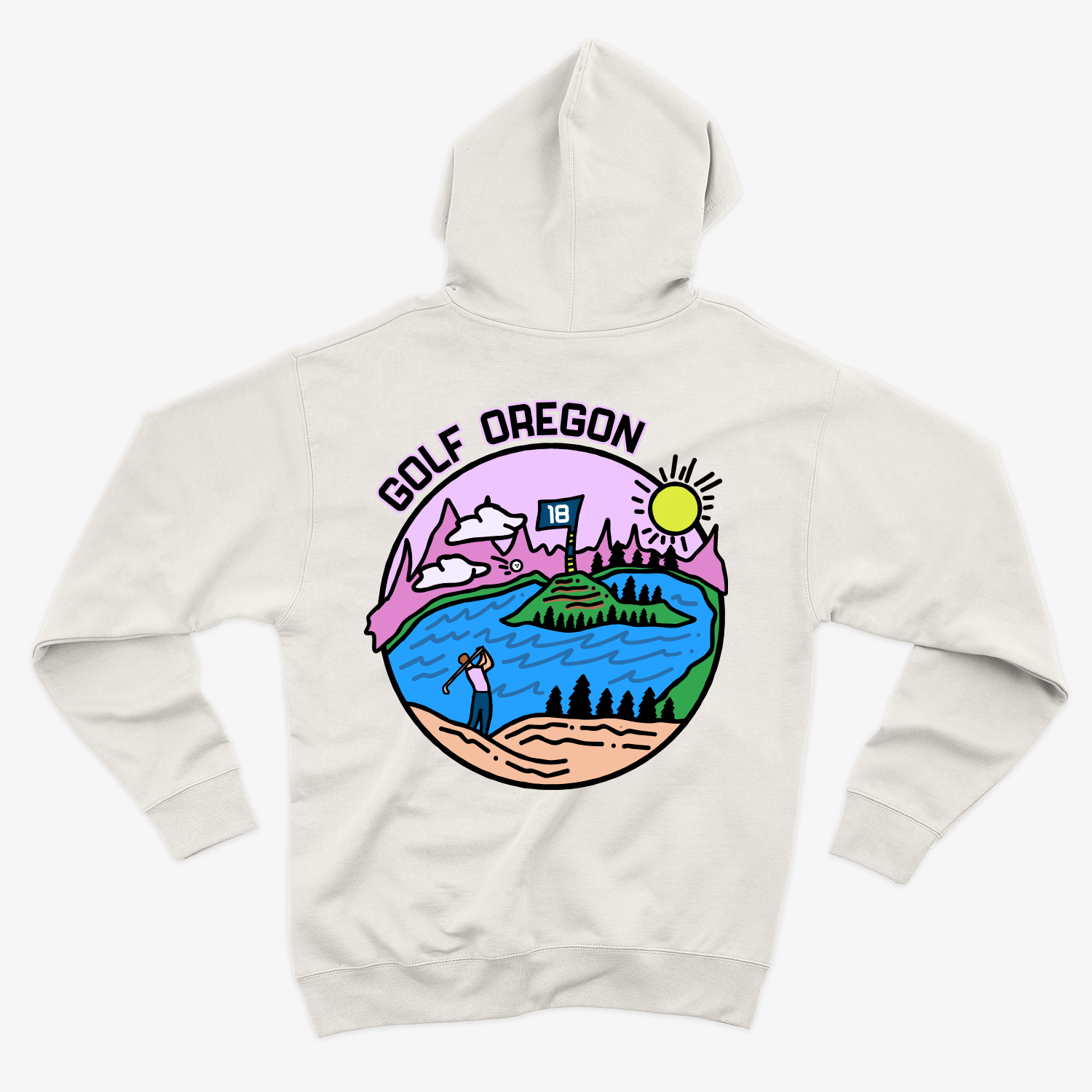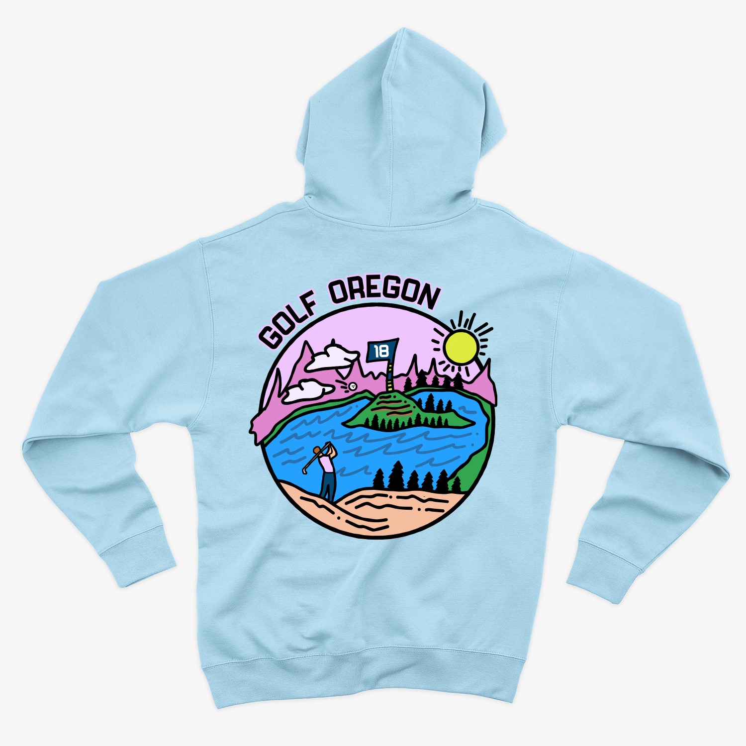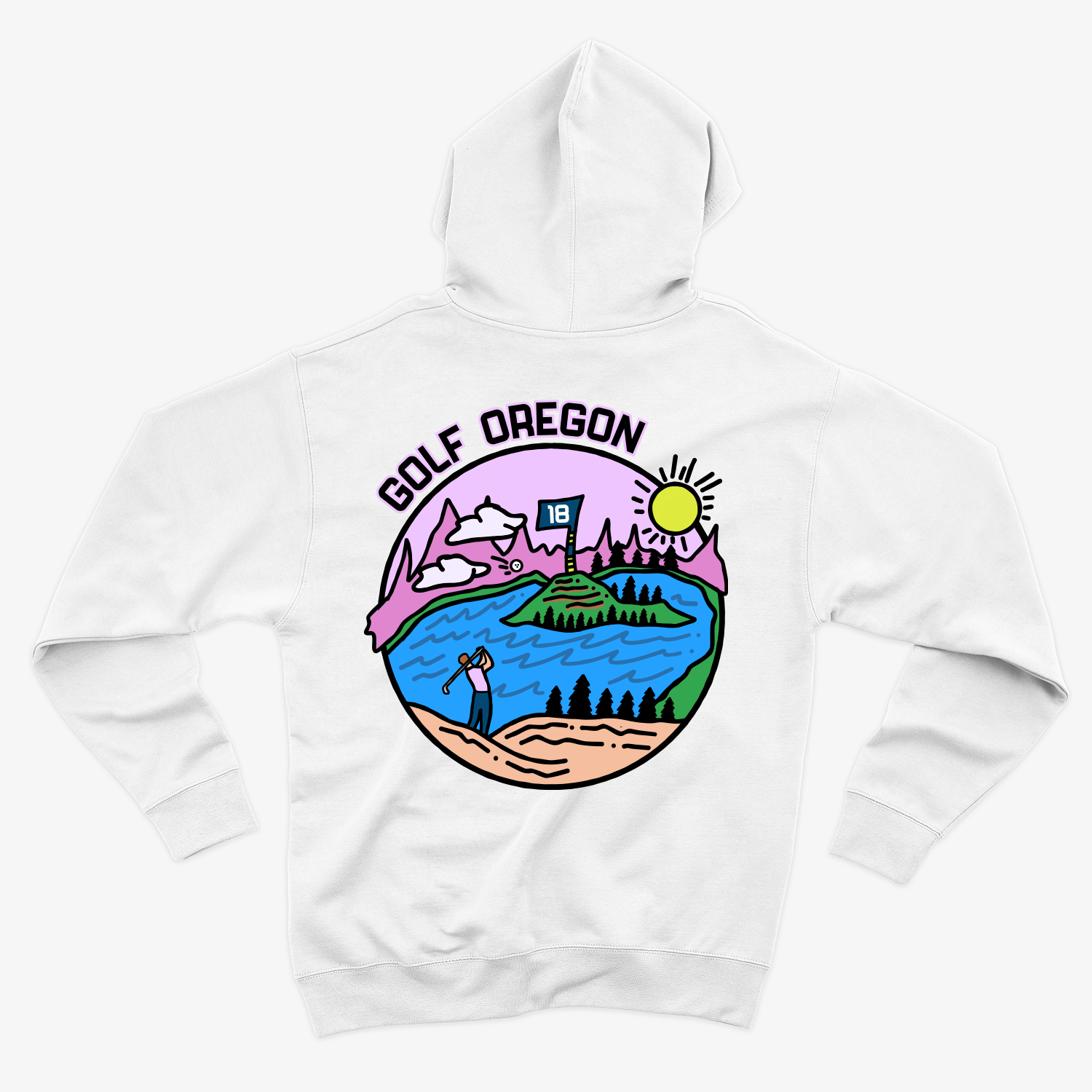 This hoodie reimagines Oregon golf through the lens of Crater Lake’s stunning caldera — reworked as a surreal take on TPC Sawgrass’s iconic 17th hole. The circular silhouette of the lake becomes the island green.