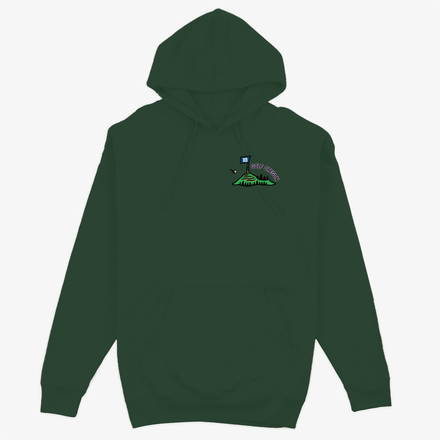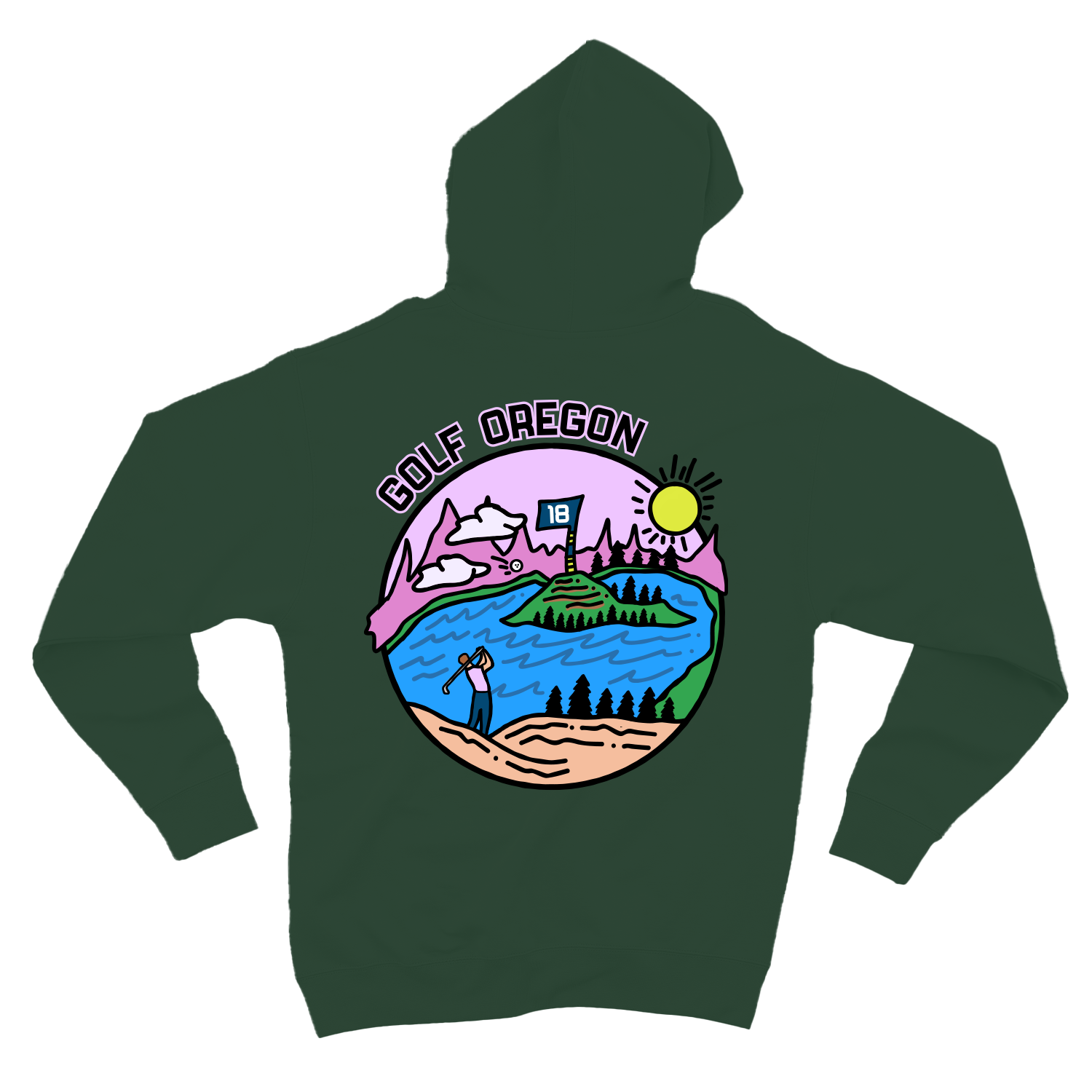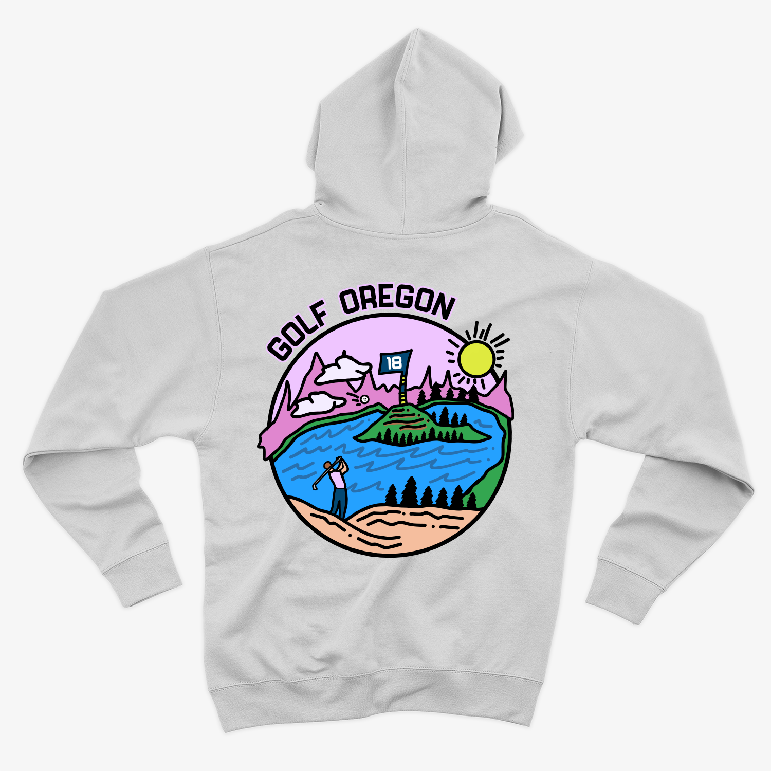This hoodie reimagines Oregon golf through the lens of Crater Lake’s stunning caldera — reworked as a surreal take on TPC Sawgrass’s iconic 17th hole. The circular silhouette of the lake becomes the island green.