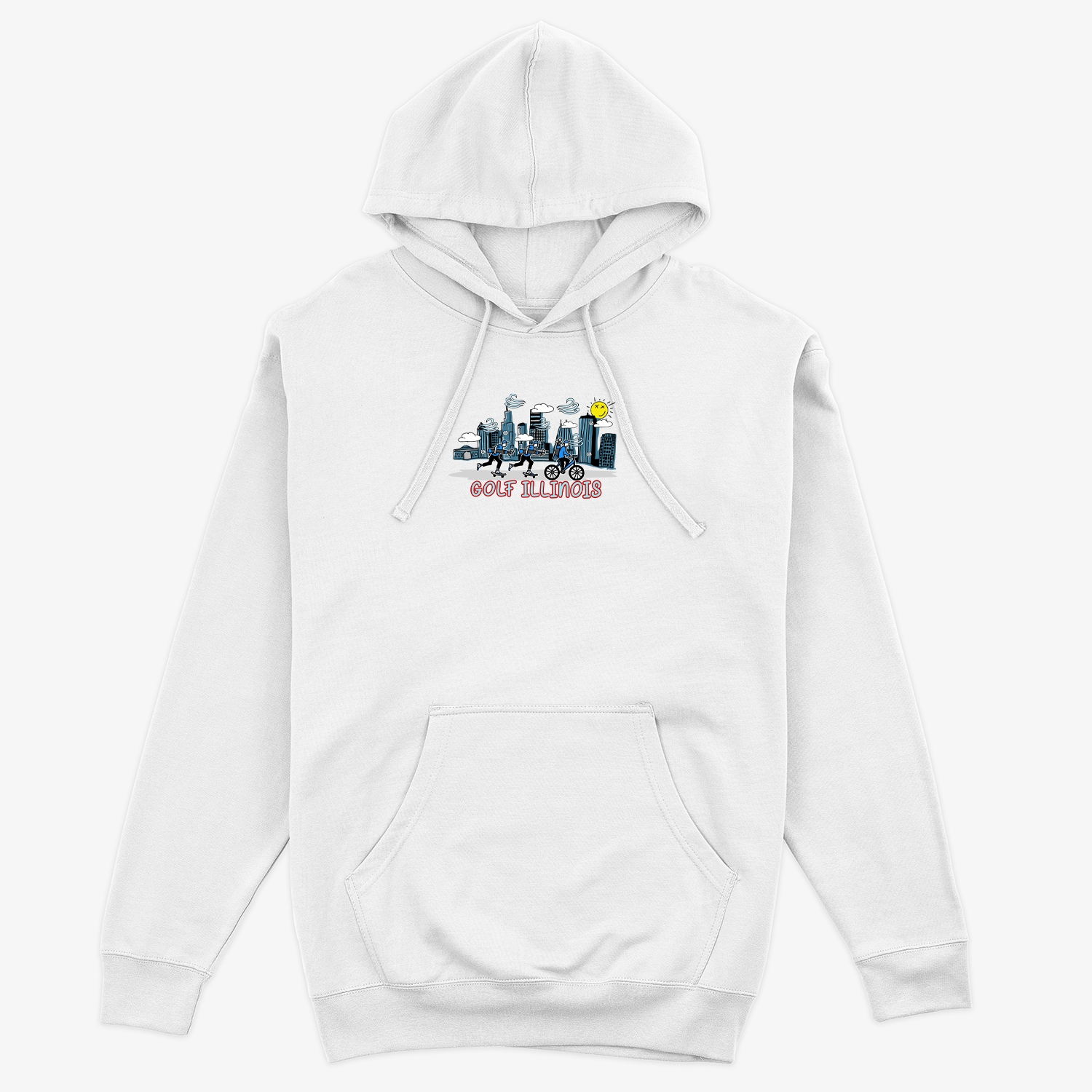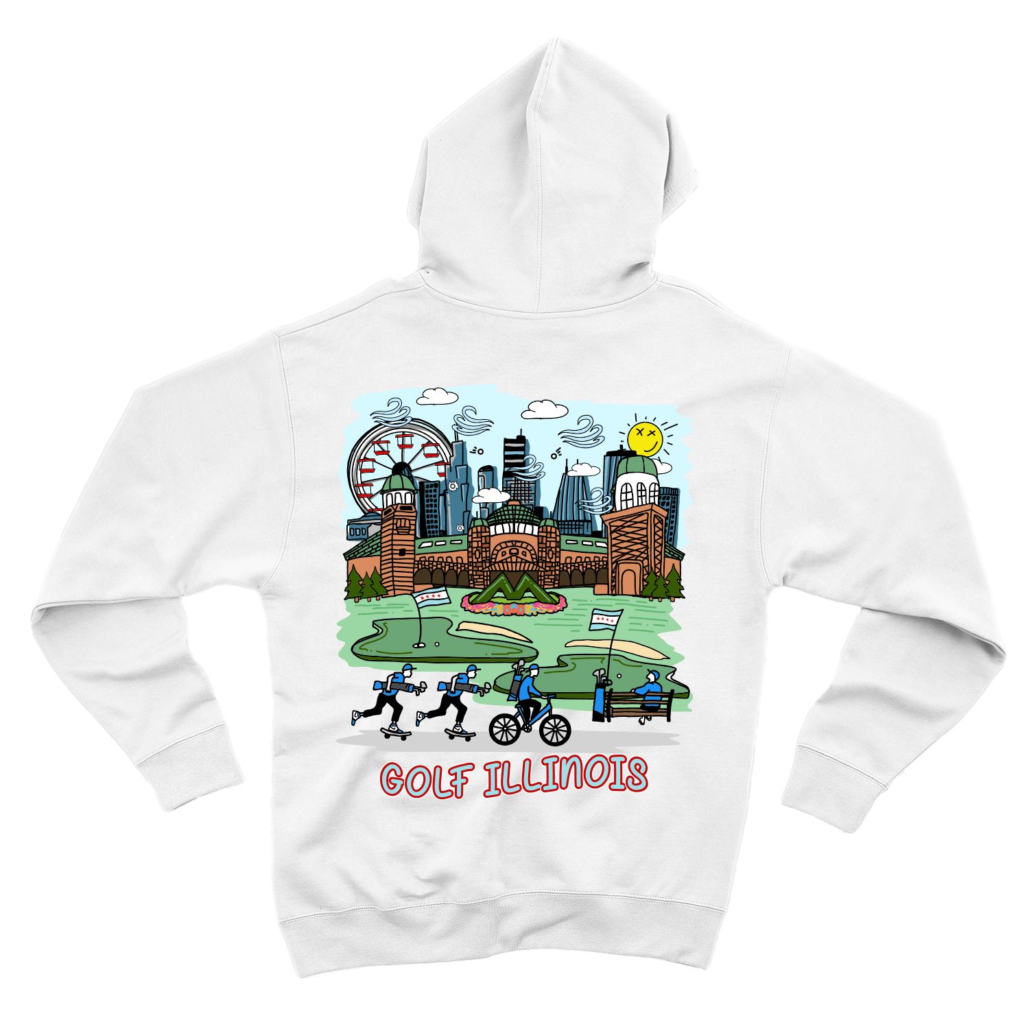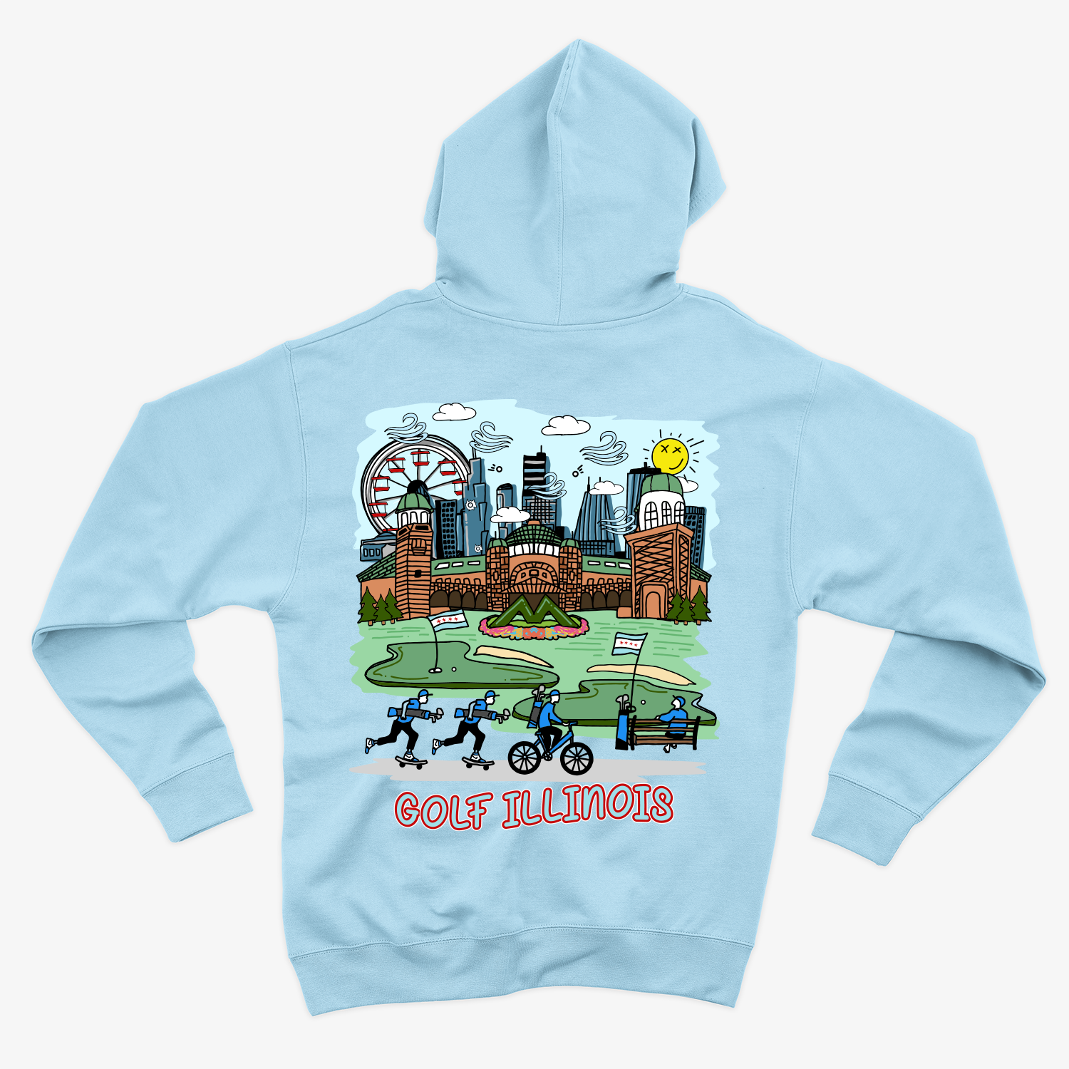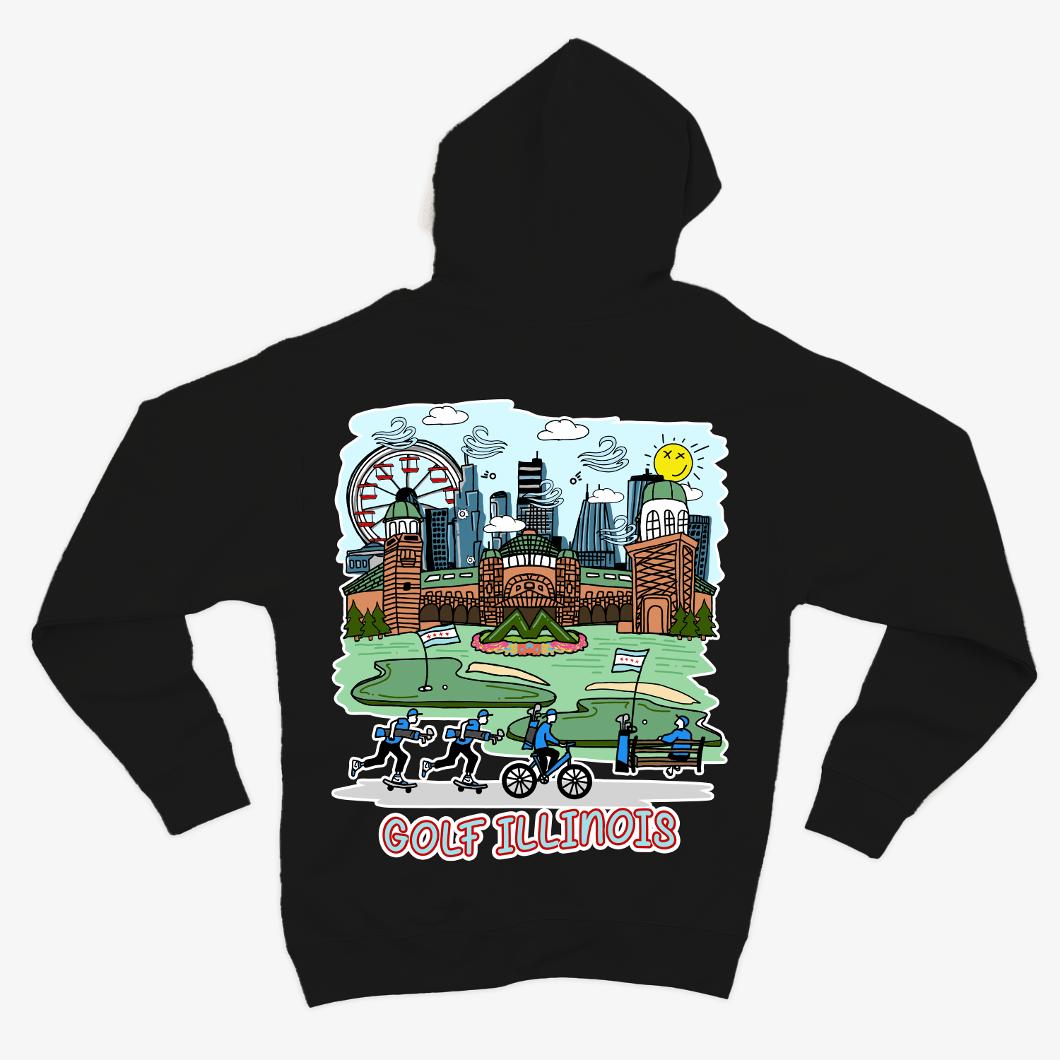 This hoodie pays tribute to Illinois golf with inspiration from Medinah Country Club, one of the state’s most iconic courses. The design blends the elegance of Medinah with the energy of the Chicago skyline, framed by elements of the Chicago flag for a bold local touch.