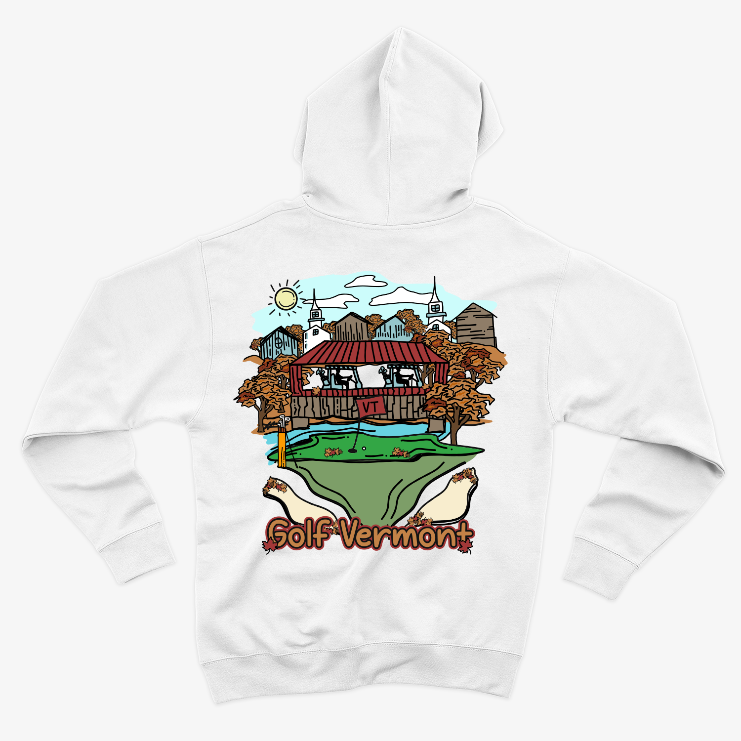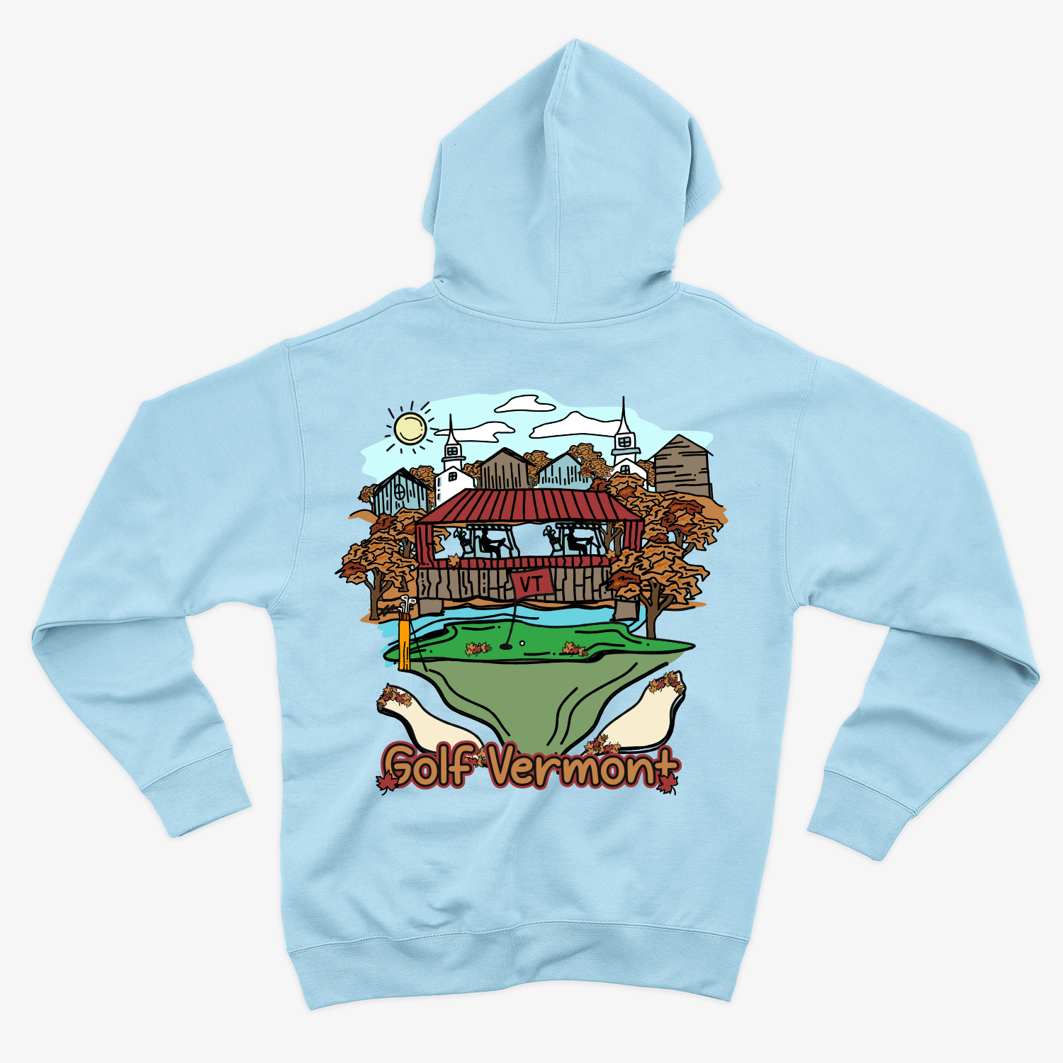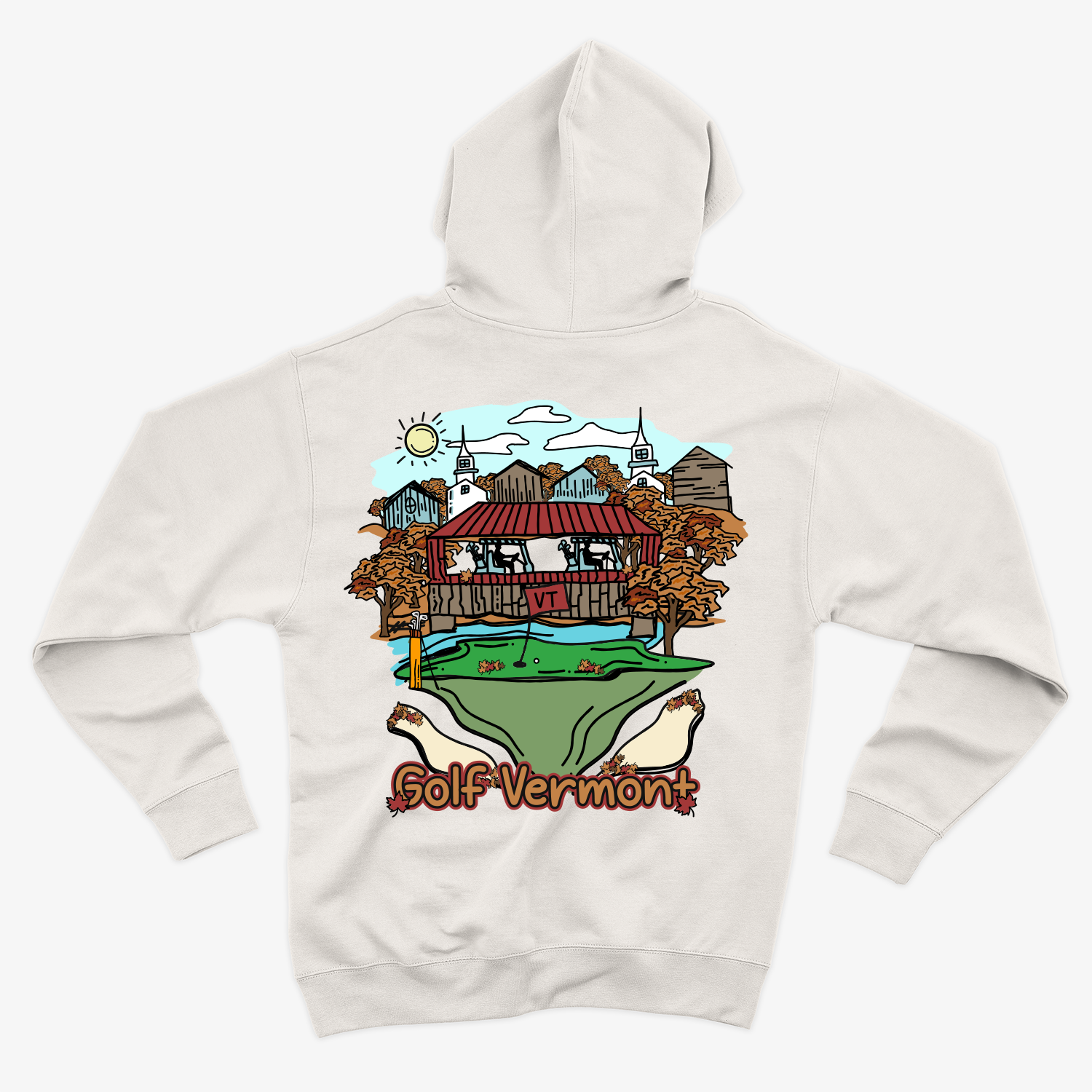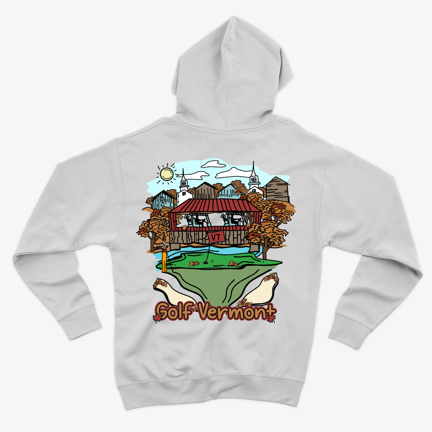 This Vermont golf hoodie is inspired by fall colors, small towns, and the iconic bridges scattered throughout the state. A design that brings the quiet charm of Vermont to the course.