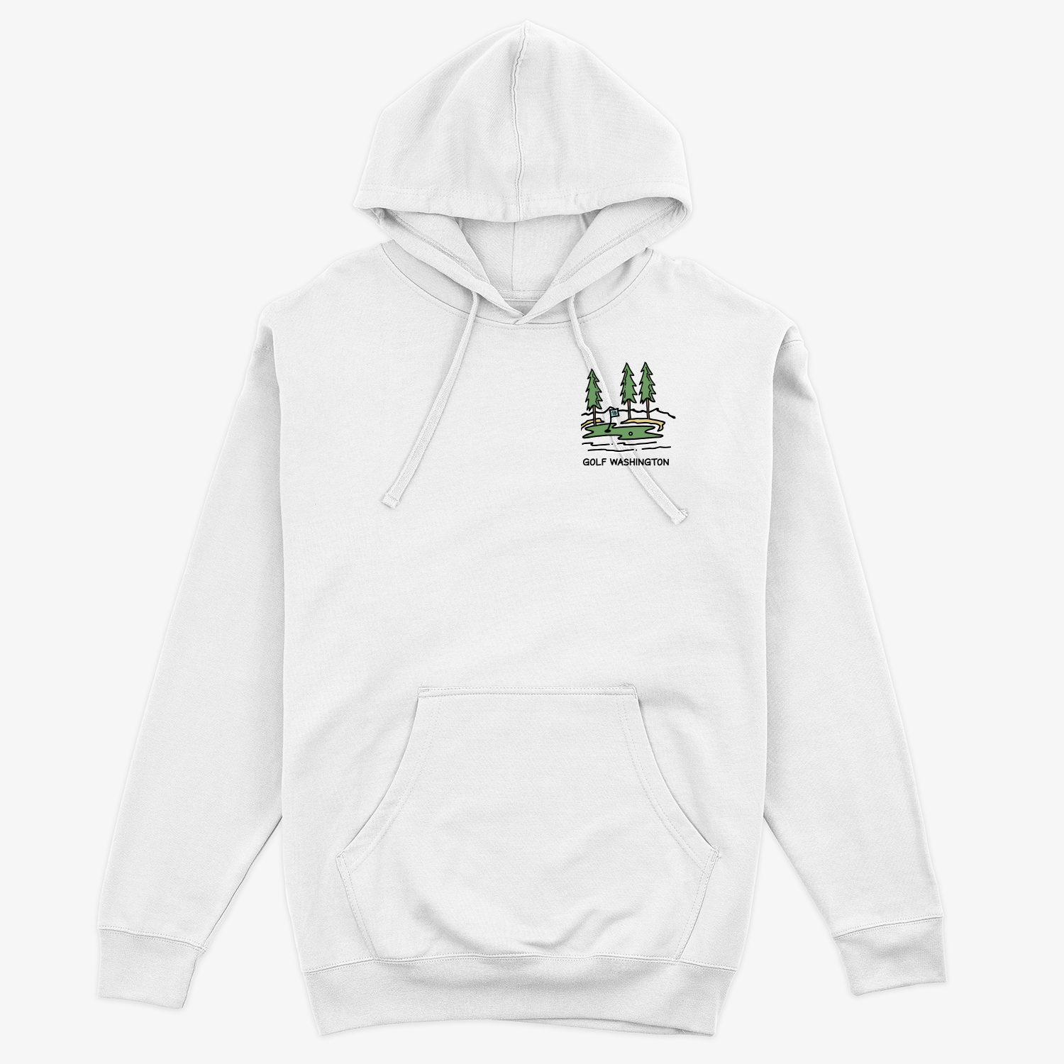 This hoodie captures the wild beauty of Washington golf — where mountain views meet vineyard-lined fairways. Set against the backdrop of purple peaks and evergreens, the design features a scenic 18th hole bordered by water and rock cliffs.