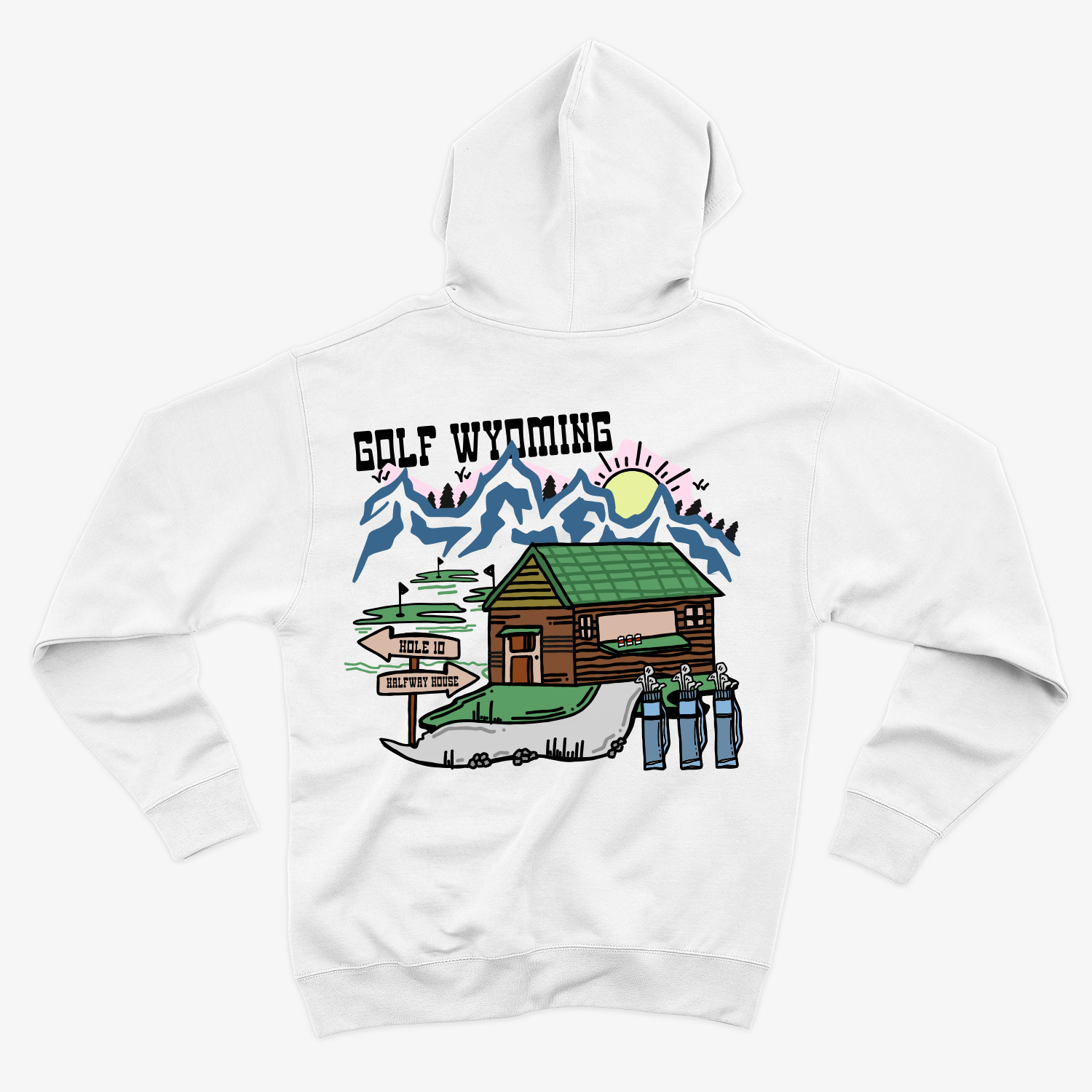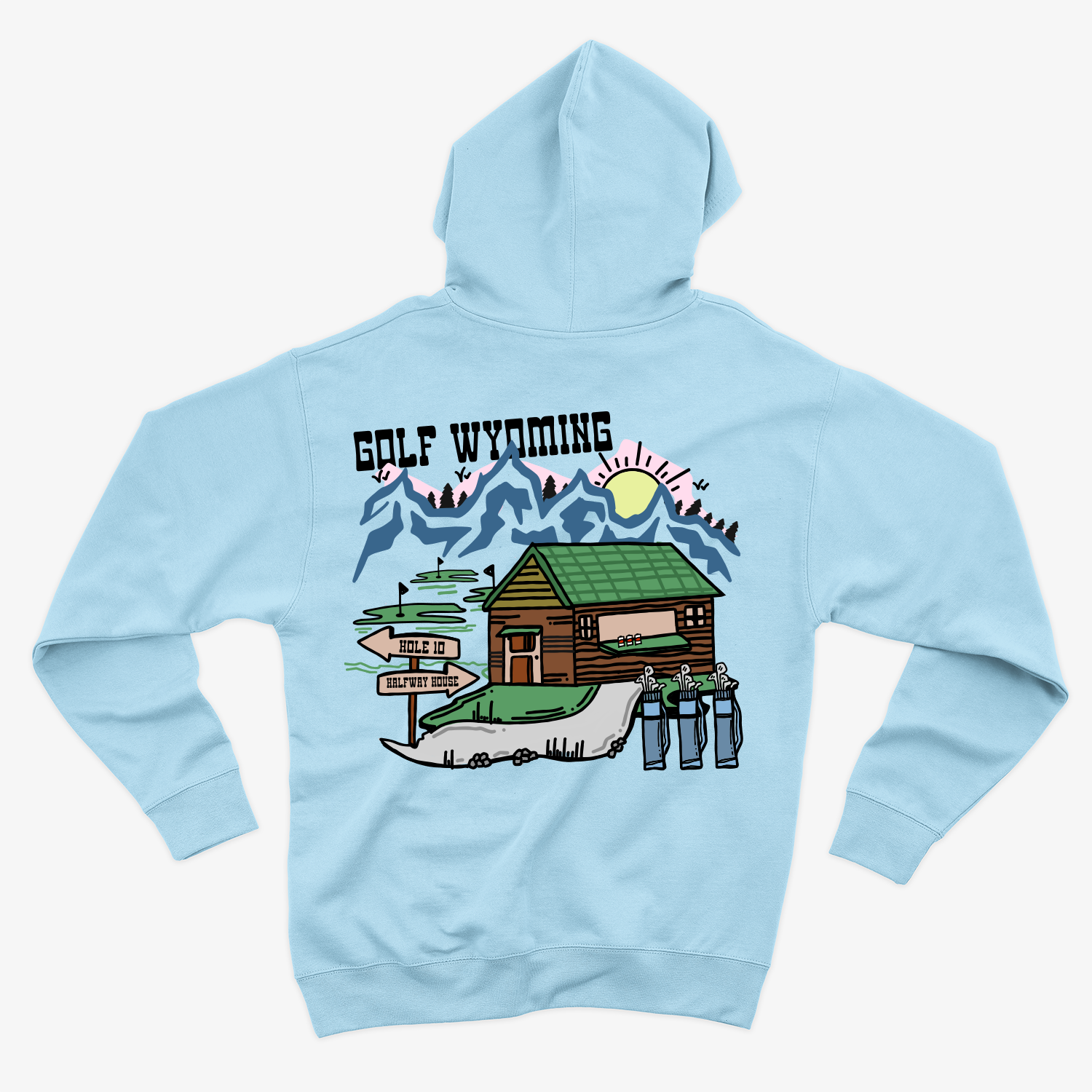 Inspired by the towering mountain ranges and the quiet charm of a halfway house tucked into the hills, this design captures a moment of rest and reflection mid-round. With nods to Wyoming’s rugged landscape and the timeless rituals of golf, this tee brings together nature and sport in one laid-back look.