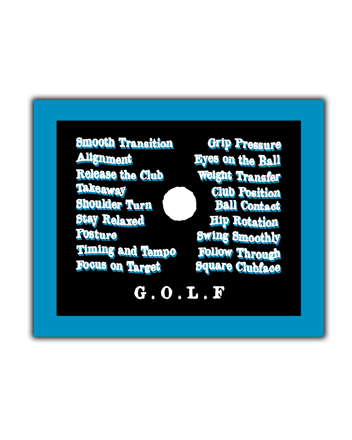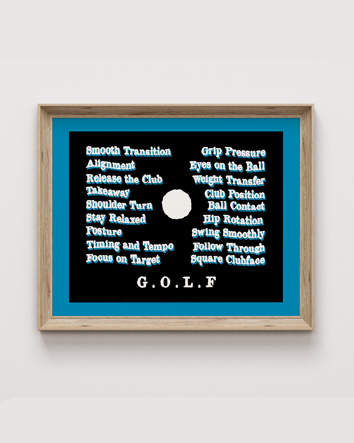 This poster is built for golfers who love the craft of the swing. Clean, bold typography lays out the core fundamentals of golf — movement, timing, alignment, rotation, tempo, and focus — all centered around a golf ball graphic that anchors the entire design. It’s a reminder of the small details that make the biggest difference on the course.